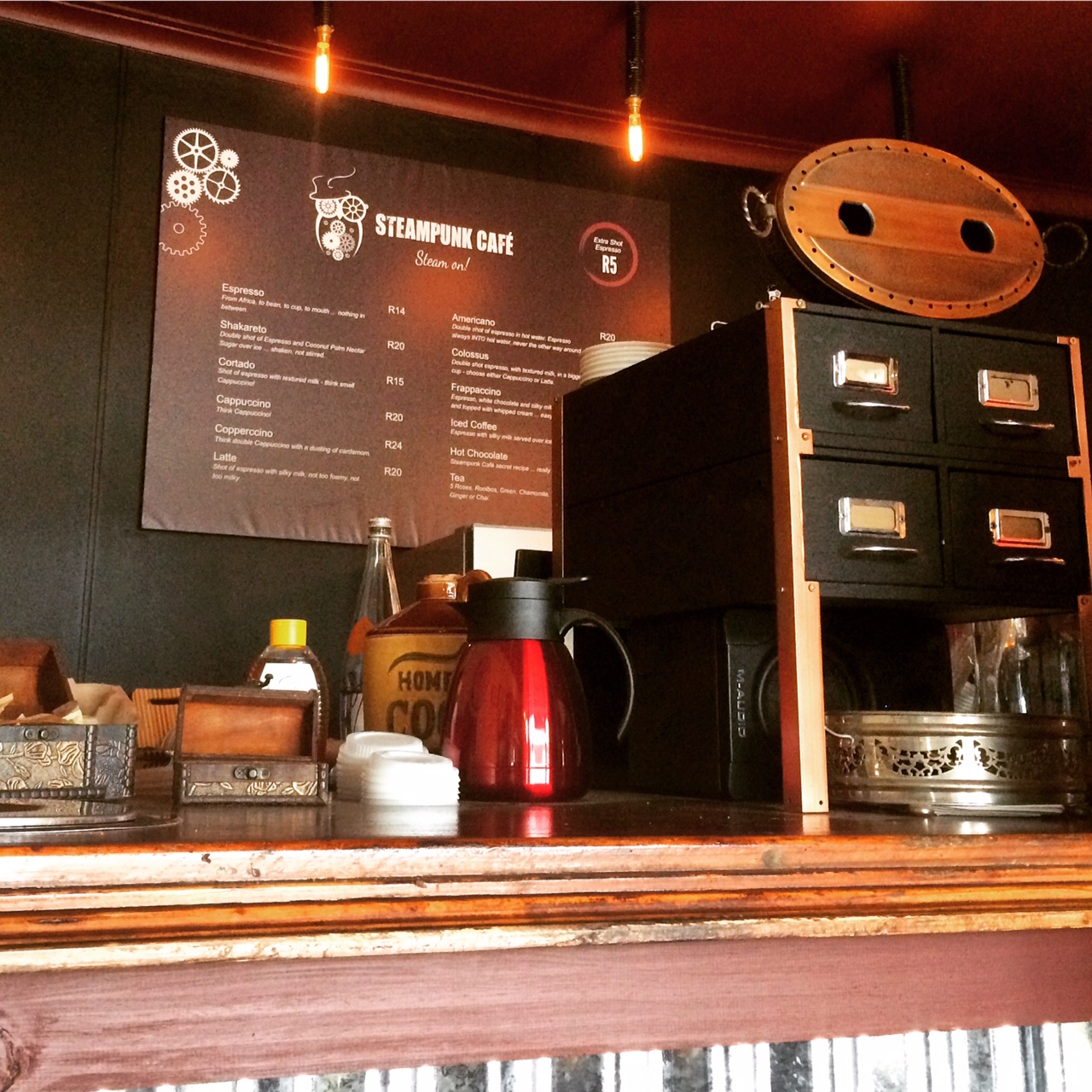 Just past the capture site at the petrol station on the left, is Steampunk Café (http://www.steampunkcoffee.co.za). It’s an awesome coffee shop and if you are going too fast you will probably miss it. You get R2 off a cup of coffee if you take your own mug. I suggest stopping on the way up, and the way down. The coffee is really good. Adding to the atmosphere is a local dog who comes to visit and stays on the welcome mat the whole day. Good coffee, good place to sit and chat. I have customers up in Howick, and I stop here at least once a week.
